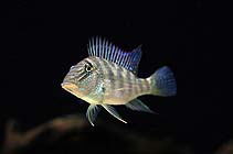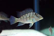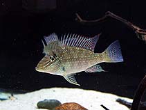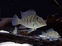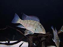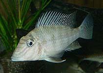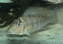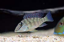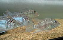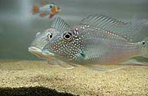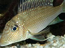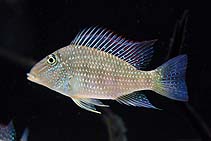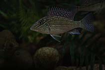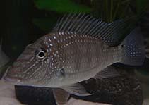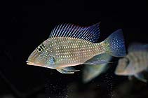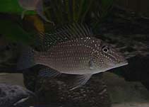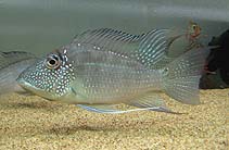 This Satanoperca species has a streamlined body shape which is a silvery blue-grey colour. There are no black markings present apart from a small black spot on the upper caudal peduncle. Depending on mood this species can show a faint horizontal band on the flanks, or a series of vertical lateral bars (some forming a Y shape) or no banding pattern at all. The head area from the mouth to the back of the gill plates are covered in numerous small whitish or iridescent bluish spots, often with a reddish background. These spots are also present along the back immediately below the dorsal fin. The tips of the dorsal fin spines are black.