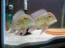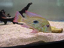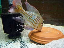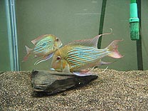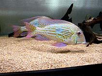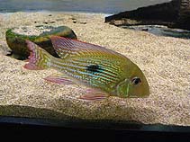 High body profile, highly spotted caudal fin, five diagonally sloping lateral bars, lateral spot can look oval at times, black preopercular mark, can show a black throat area, can show an area of bright red scales between the head and lateral spot.