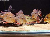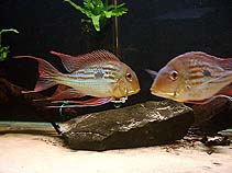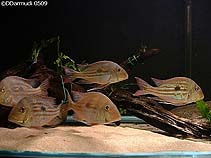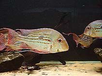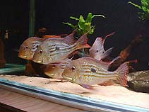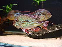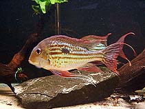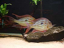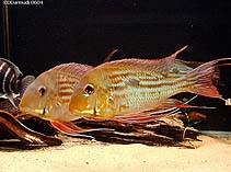 It appears this species has 5 diagonal lateral stripes (similar to G. sp. "Rio Branco"), a black pre-opercular mark and a somewhat semi-striped caudal fin. Adults are quite easy to distinguish as they have quite a unique look.